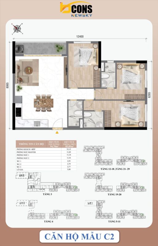 • 3PN + 2WC: 72 m² – 81 m².