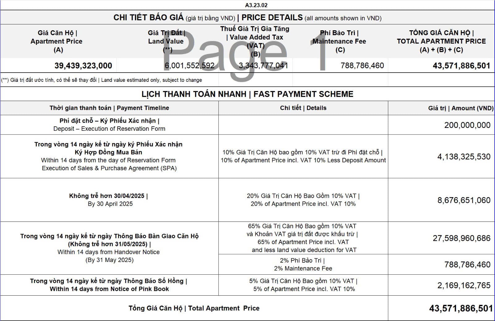 – Giá bao gồm VAT, 2% KPBT: 43ty5