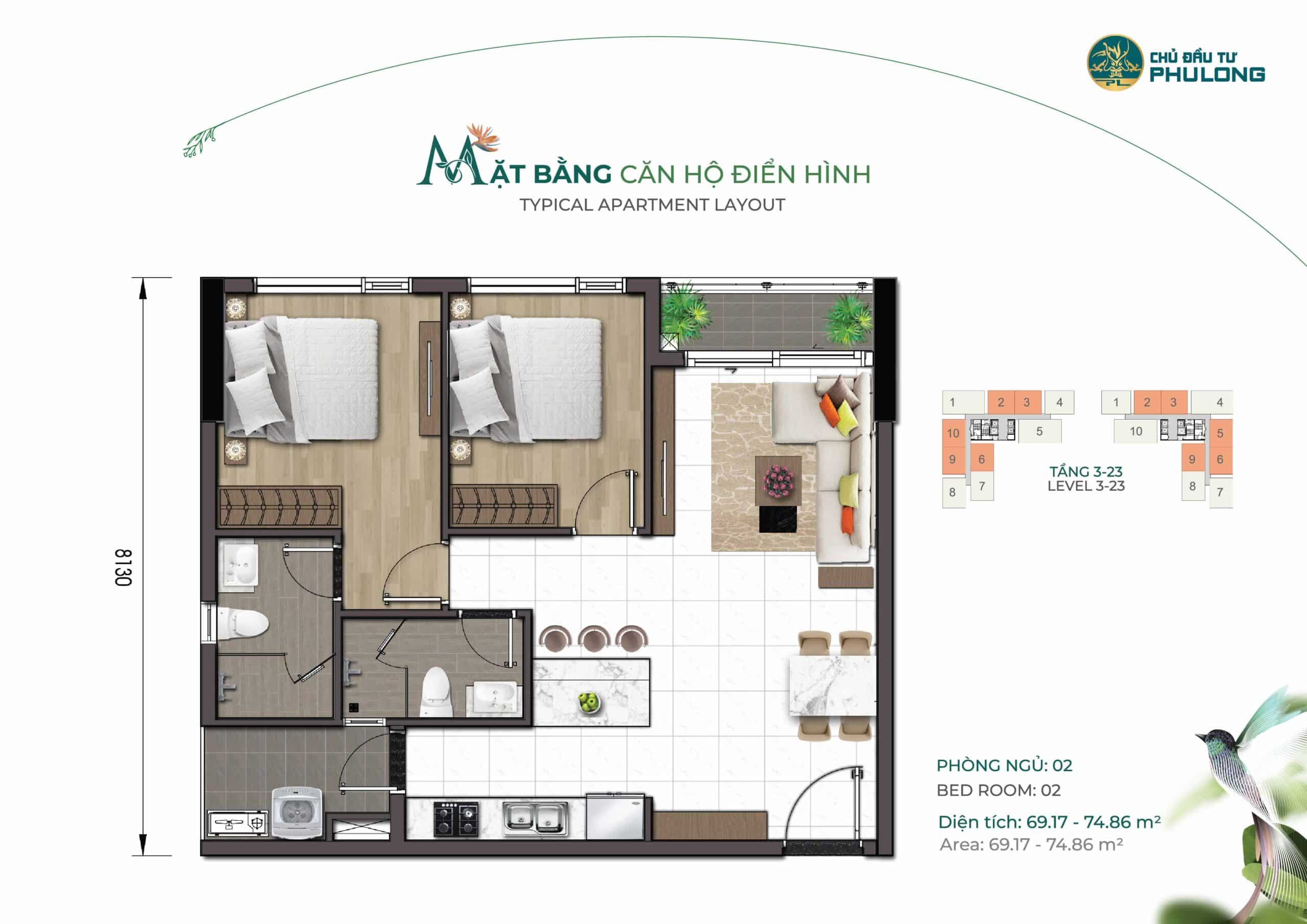 • Căn 2PN (72m2 – 81m2) : 330 căn