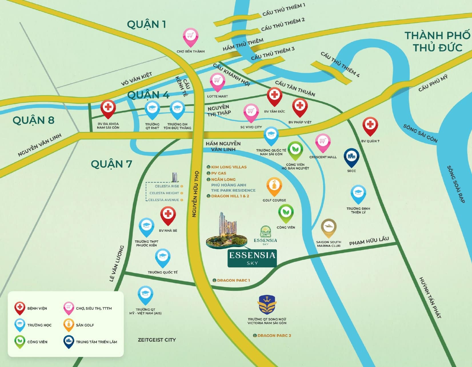 • Kết nối trường Đại Học RMIT, Tôn Đức Thắng, Trường quốc tế Nam Saigon (Mỹ), Trường Quốc tế BVIS (Anh), Kinder World (Mỹ- Singapore), Trường Nhật Bản, Hàn Quốc, Đài Bắc…; Bệnh viện FV, bệnh viện tim Tâm Đức, các phòng khám đa khoa, Siêu thị Lotte, Vivo City, Cresent Mall,
