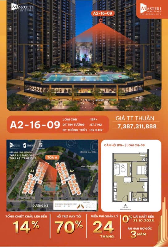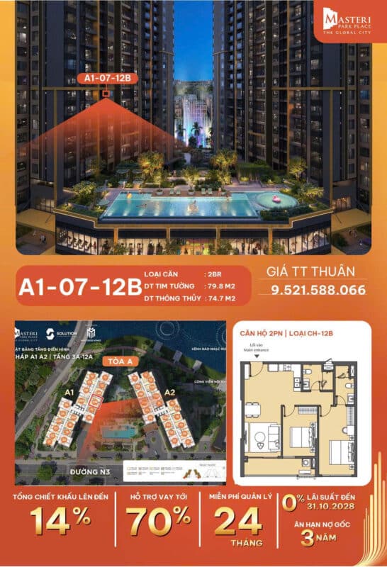 Khu đô thị The Global City đang trở thành tâm điểm thị trường căn hộ Quận 2 nhờ quy hoạch chuẩn quốc tế, loạt tiện ích biểu tượng và tốc độ hoàn thiện hạ tầng cực nhanh. Trong đó, phân khu Masteri Park Place – đặc biệt là tòa A1 & A2 sở hữu view trực diện kênh đào nhạc nước 2km – đang được xem là giỏ hàng đắt giá nhất hiện tại.