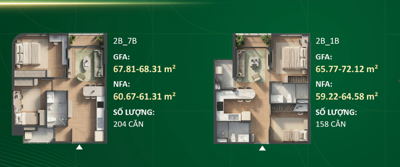 • Diện tích GFA: 65.77 – 72.12 m²