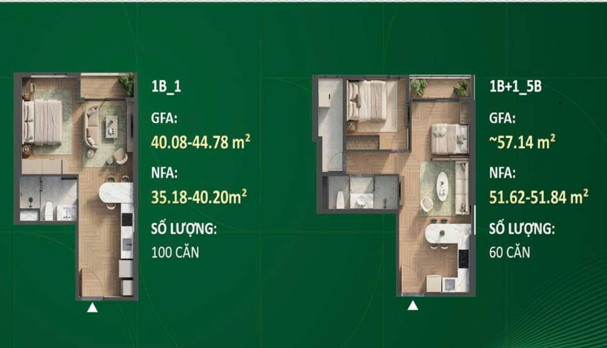 • Diện tích GFA: 40.08 – 57.14 m²