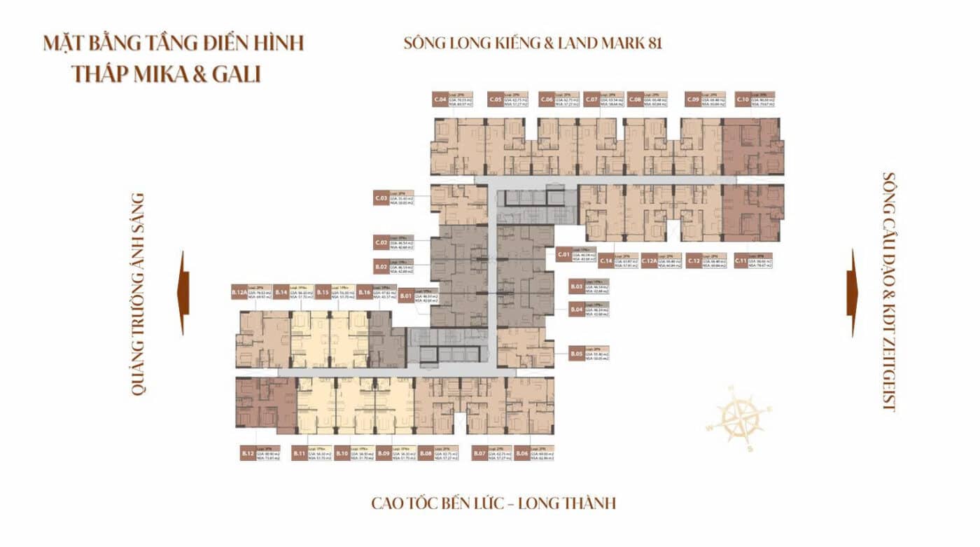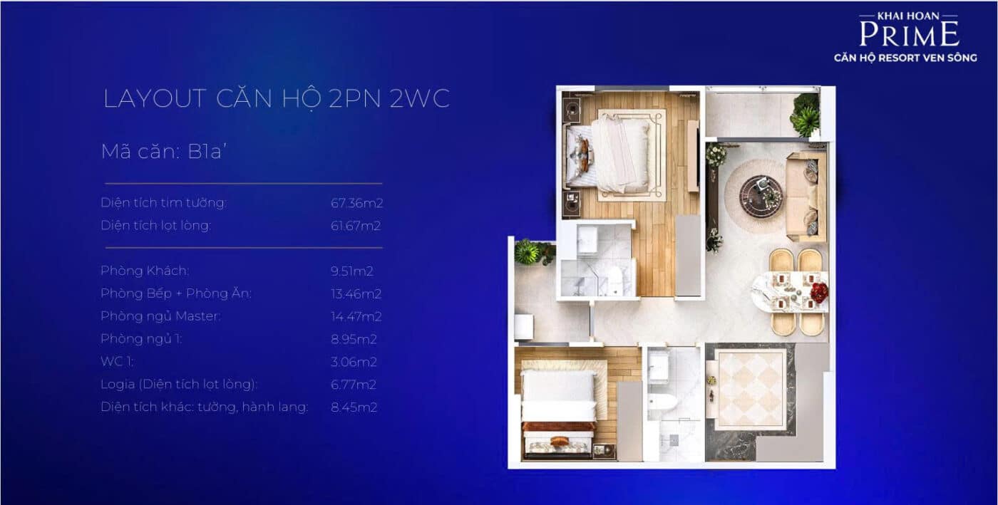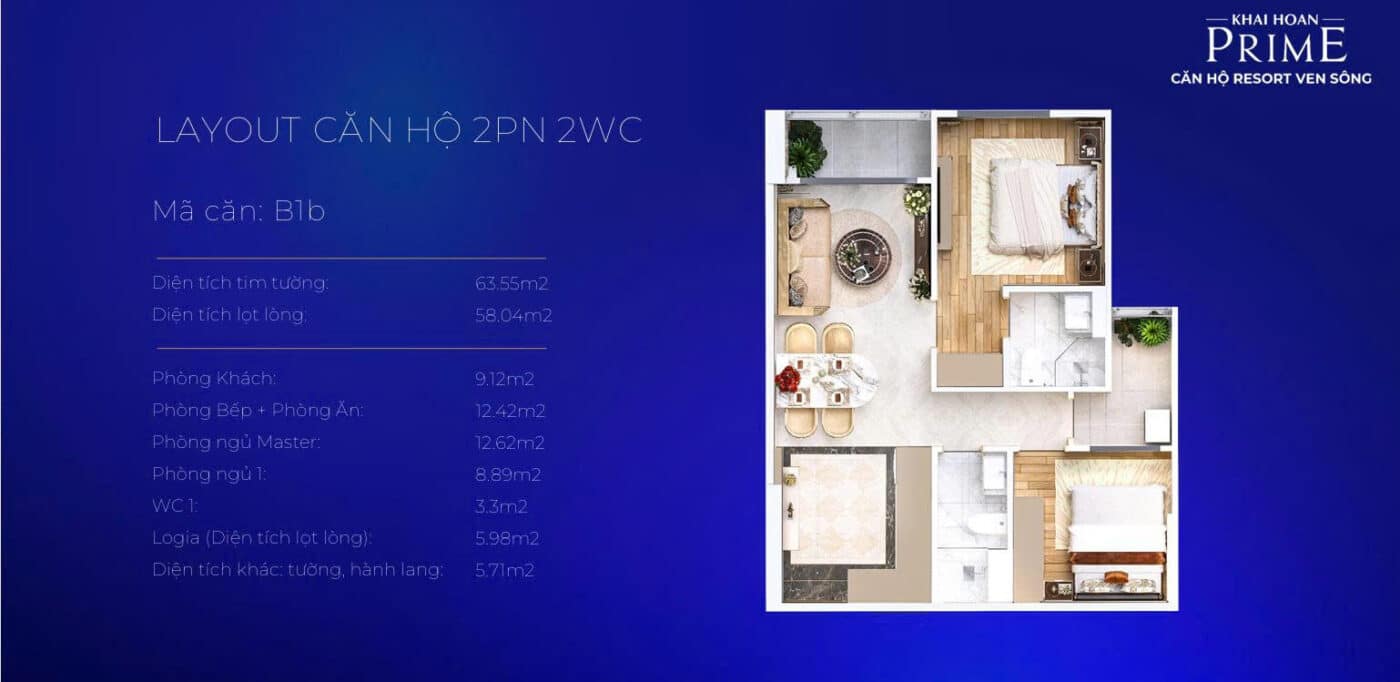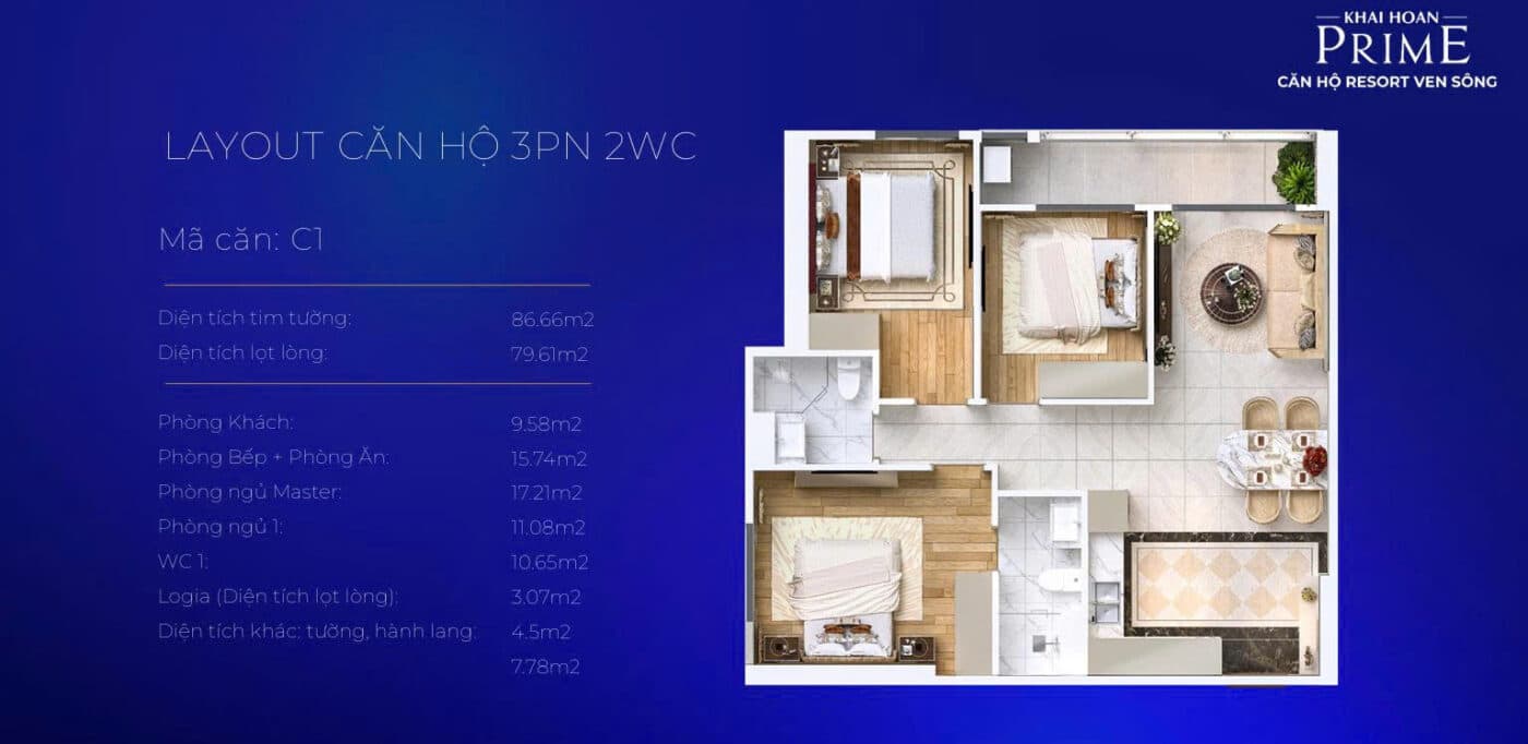 Diện tích căn hộ đa dạng: 1PN (~45–56 m²), 2PN (~63–80 m²), 3PN (~86–90 m²).