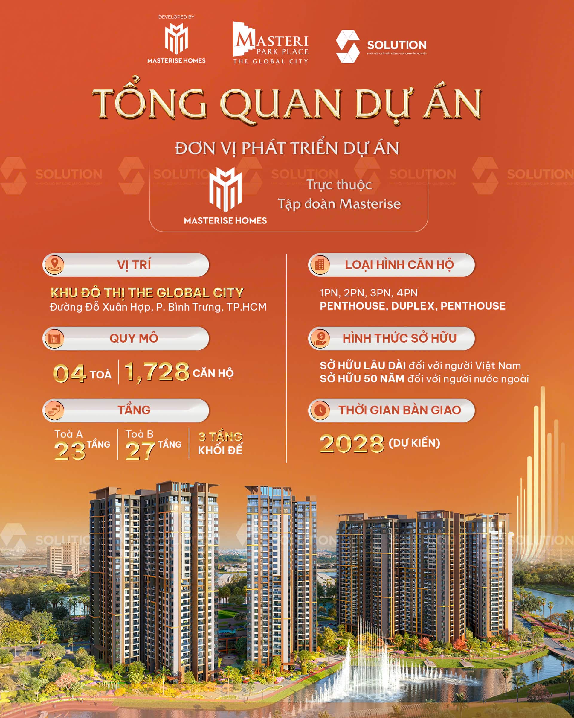 Masteri Park Place là một phân khu căn hộ cao cấp thuộc dòng sản phẩm Masteri Collection của chủ đầu tư Masterise Homes – một trong những tập đoàn bất động sản hàng đầu Việt Nam, nổi tiếng với các dự án đẳng cấp quốc tế. Dự án được chính thức ra mắt vào ngày 15/10/2025, đánh dấu bước tiến mới trong việc hoàn thiện bức tranh đại đô thị The Global City tại trung tâm TP. Thủ Đức (Quận 2 cũ), TP. Hồ Chí Minh. Với thiết kế tinh tế từ các đối tác quốc tế như Foster + Partners (thiết kế đô thị), HBA (thiết kế tổng quan) và Airoso Simétrico (thiết kế nội thất), Masteri Park Place không chỉ là nơi an cư mà còn là biểu tượng của lối sống thượng lưu, giao thoa giữa thiên nhiên và đô thị hiện đại.