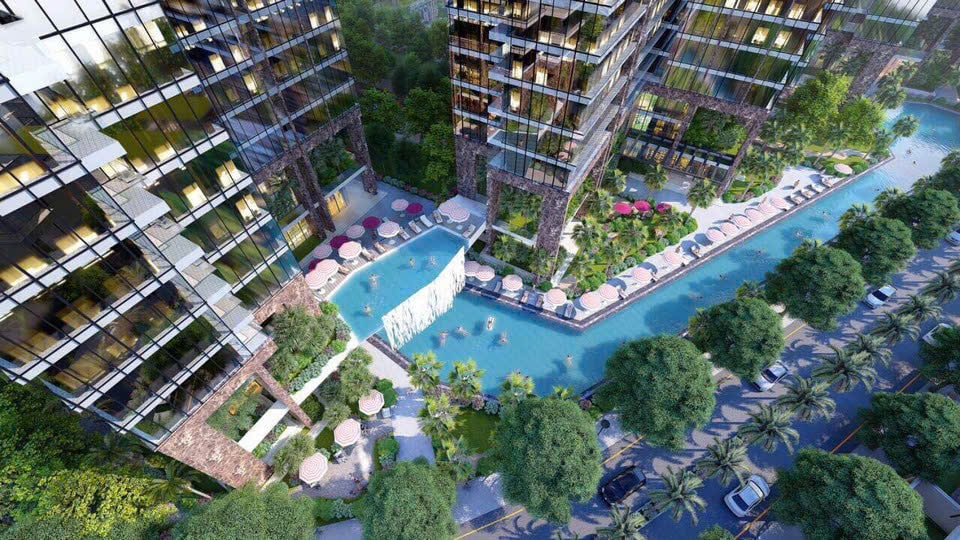 🏊♂️ Hồ bơi vô cực liên tòa & hồ cảnh quan tầng trệt, ánh sáng đổi màu buổi tối.
