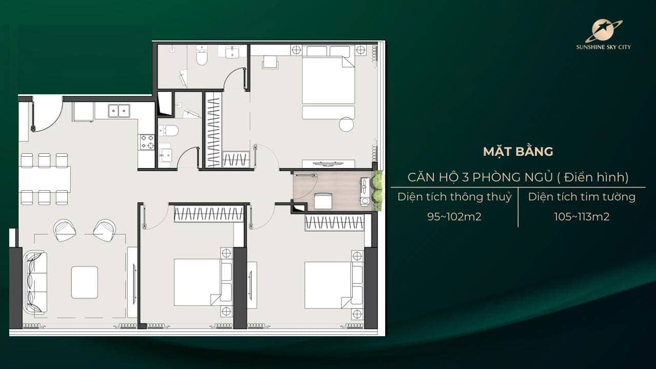 Căn 3 phòng ngủ: 104.9 m² – 116.7 m².