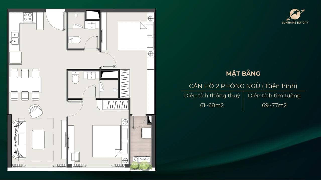 Căn 2 phòng ngủ: 77.2 m² – 85.9 m².