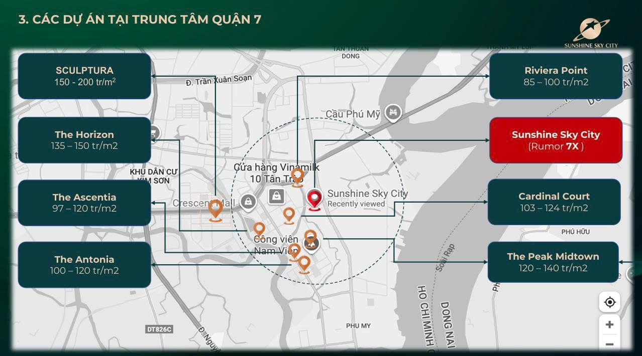 Dự án Sunshine Sky City do Sunshine Group phát triển, tọa lạc tại mặt tiền đường Phú Thuận, phường Tân Phú (Quận 7, TP.HCM) — ngay khu đô thị Phú Mỹ Hưng, vị trí ven sông Cả Cấm với khả năng kết nối đa hướng.