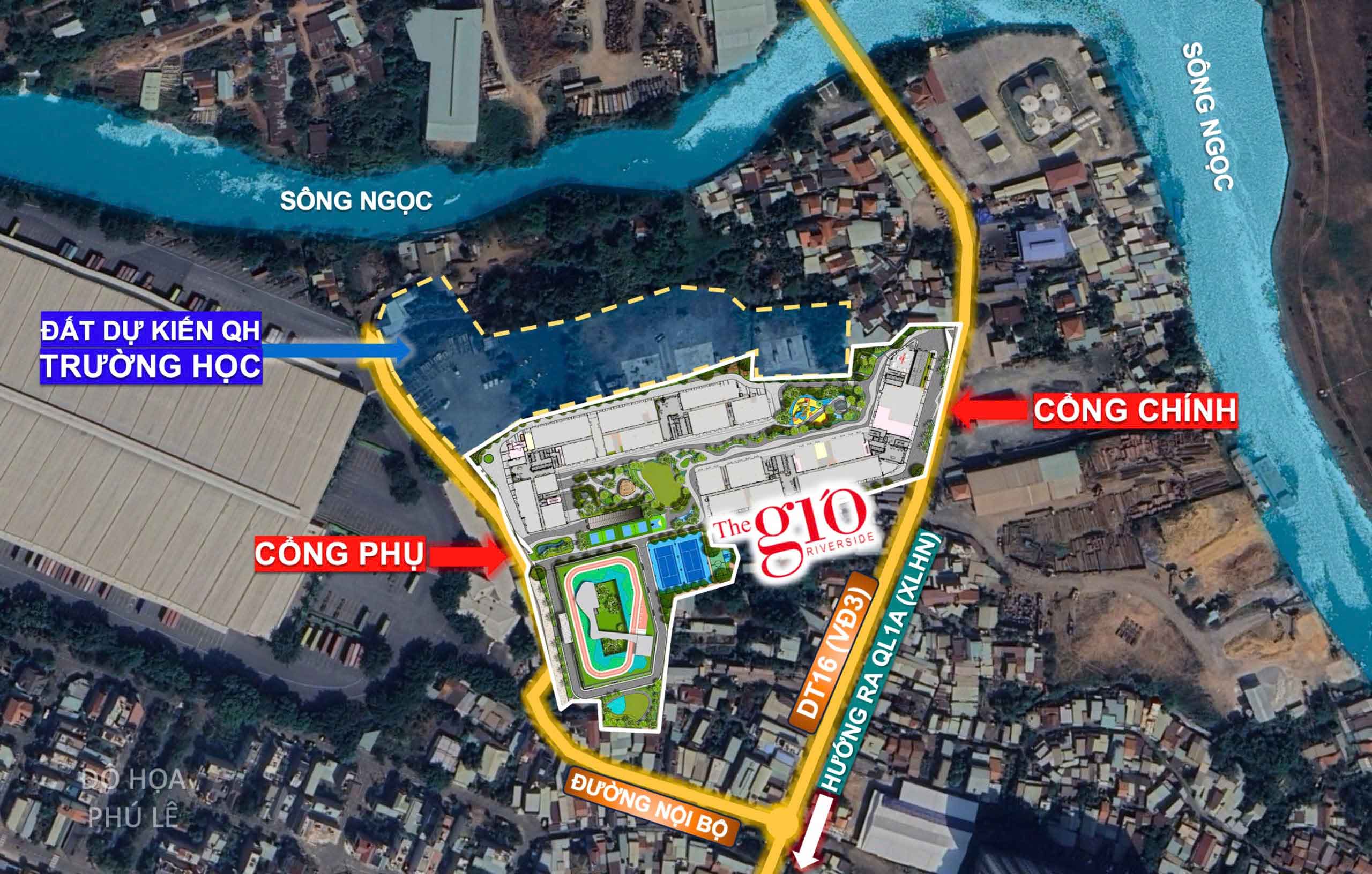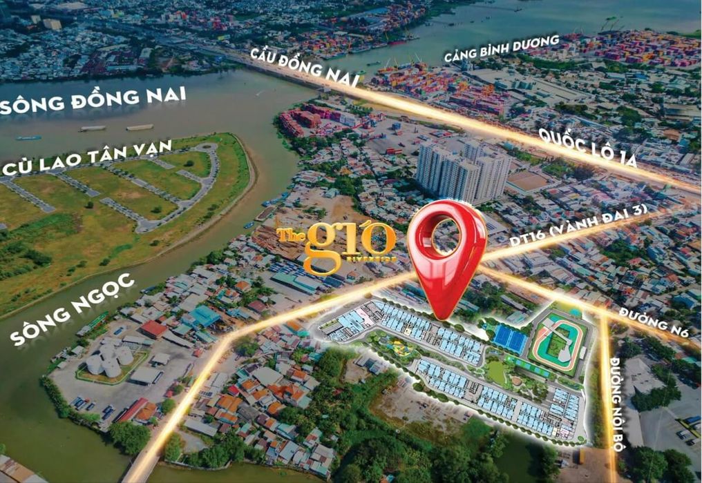 The Gió Riverside nằm trên mặt tiền đường DT16, phường Bình An, TP. Dĩ An, tỉnh Bình Dương, ngay gần ngã ba sông Đồng Nai và sông Ngọc. Dự án sở hữu vị trí chiến lược với các yếu tố “cận giang, cận lộ, cận thị”: