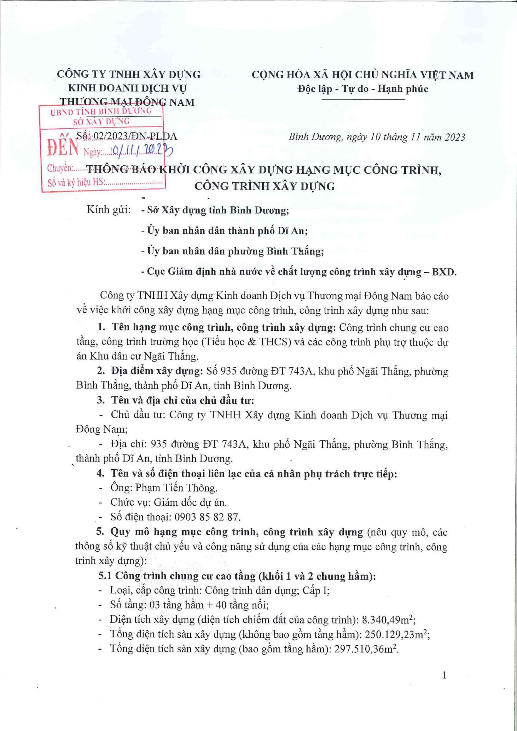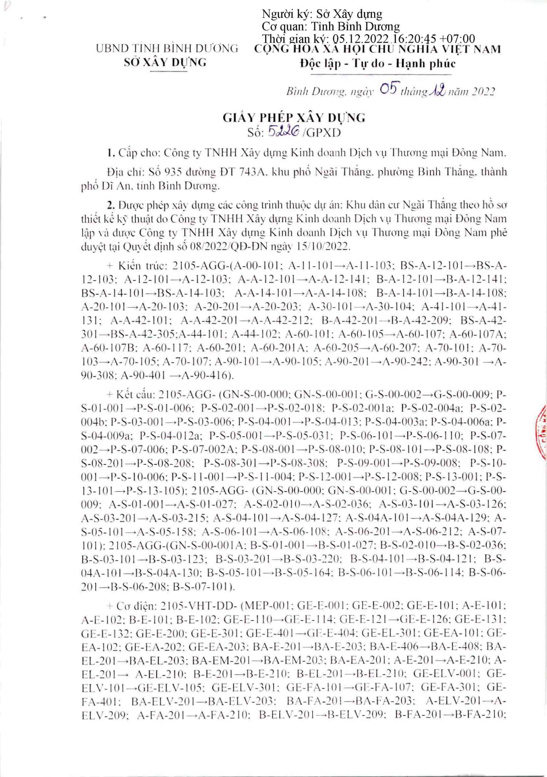 - Giấy phép xây dựng: Dự án được cấp Giấy phép xây dựng số 5226/GPXD vào ngày 05/12/2022 bởi cơ quan có thẩm quyền tại tỉnh Bình Dương. Giấy phép này cho phép xây dựng khu phức hợp với 2 tòa tháp cao 40 tầng nổi và 3 tầng hầm.