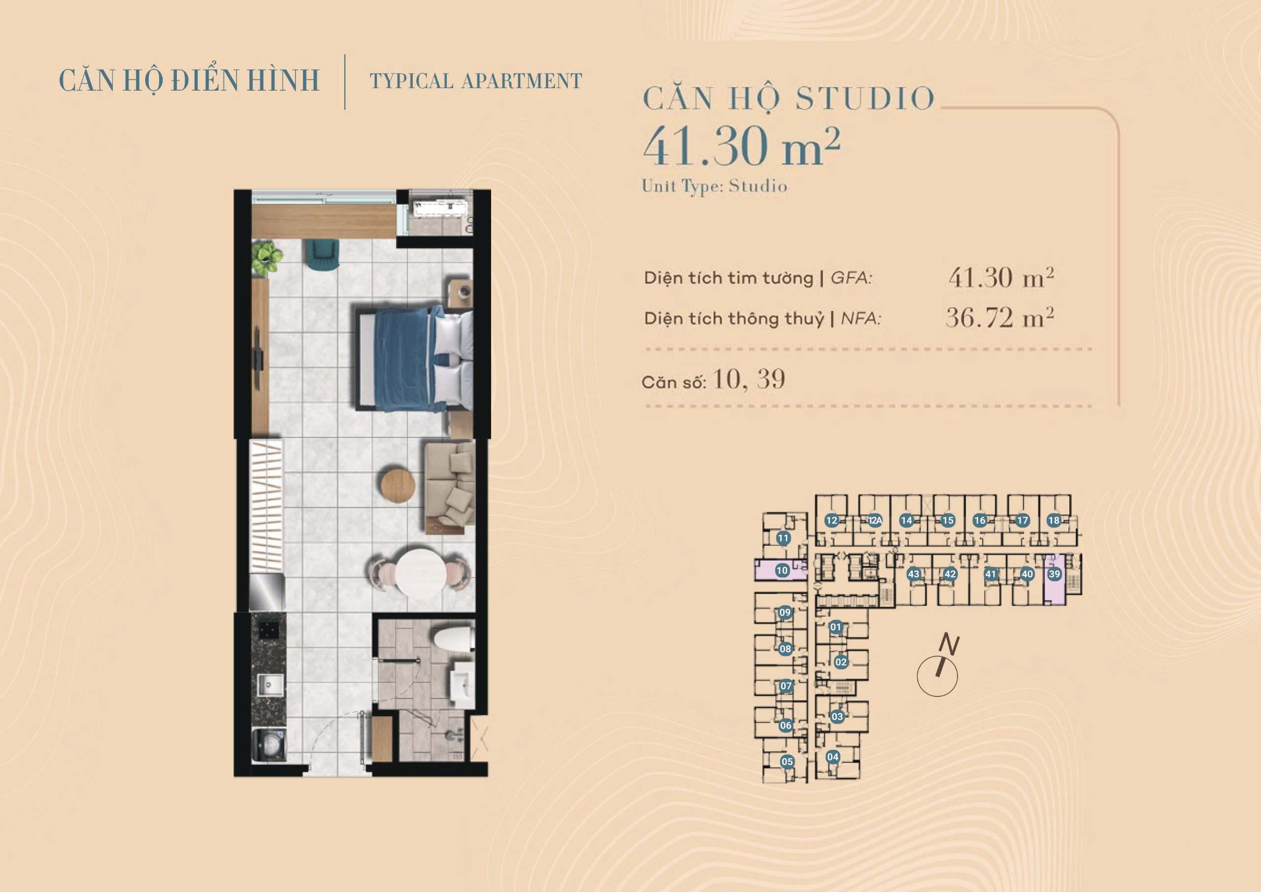 - Căn hộ Studio: Diện tích khoảng 41 m², phù hợp cho người độc thân hoặc cặp đôi trẻ.