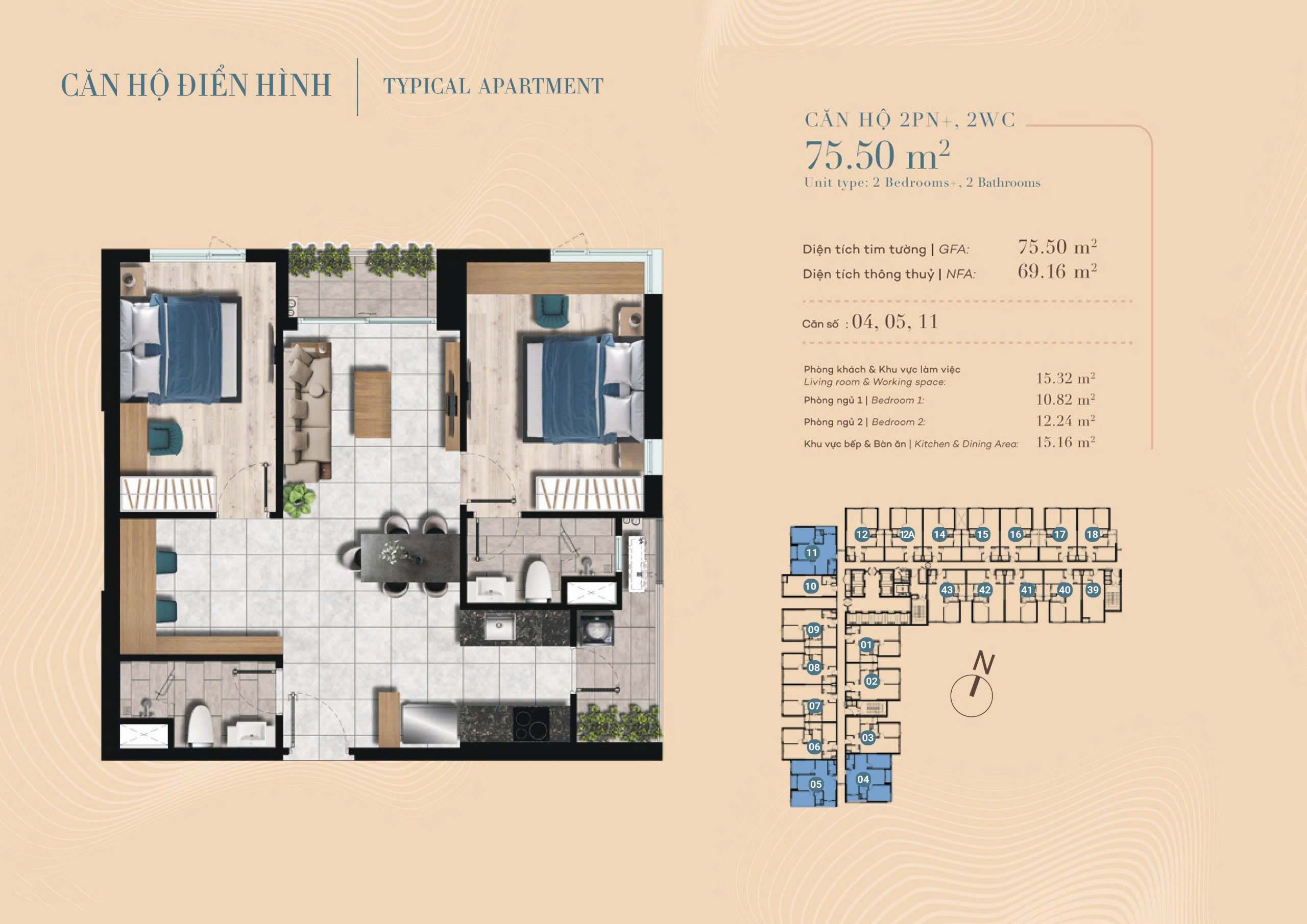 - Căn hộ 2 phòng ngủ Góc (2PN+): Diện tích khoảng 75 m², bố trí thêm không gian đa năng.
